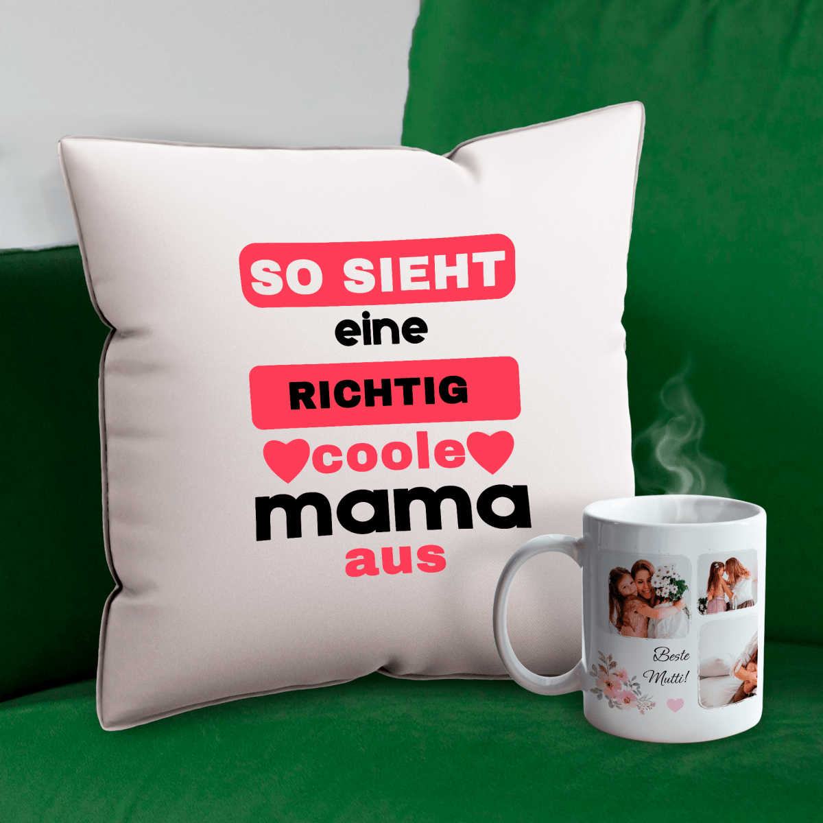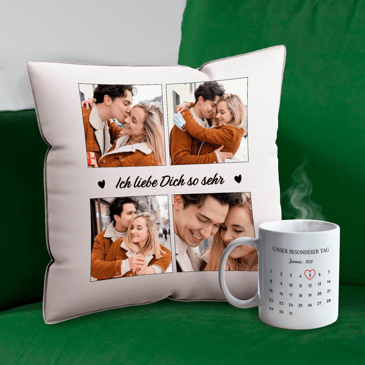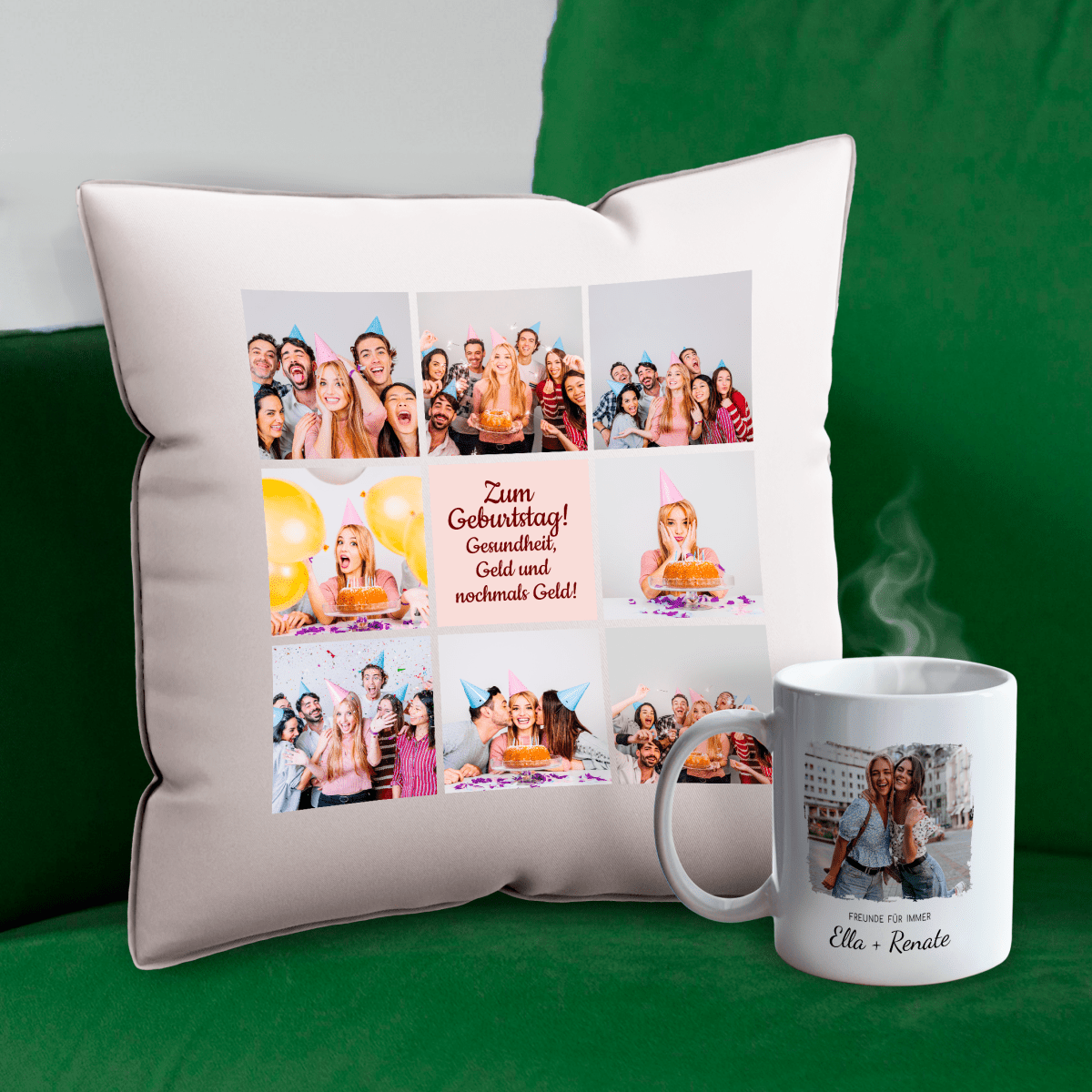 Frauen schätzen Geschenke, die durchdacht, ästhetisch und gleichzeitig praktisch sind. Es ist nicht einfach, ein Geschenk zu finden, das alle diese Kriterien erfüllt. Eine Tasse mit individuellem Aufdruck und einem Kissen gehört zu den Geschenken, die sich unabhängig vom Alter des Beschenkten und dem Anlass perfekt eignen. Dieses Set ist eine großartige Wahl als Geschenk für eine Freundin, Ehefrau oder Großmutter. Erstellen Sie im Handumdrehen ein einzigartiges Geschenk mit einem Foto oder Text Ihrer Wahl. Wenn Sie Ihre Liebste völlig überraschen möchten, ist dies eine der besten Möglichkeiten. Durch den Einsatz moderner UV-Druckverfahren können Sie sicher sein, dass die Farben lange intensiv bleiben.