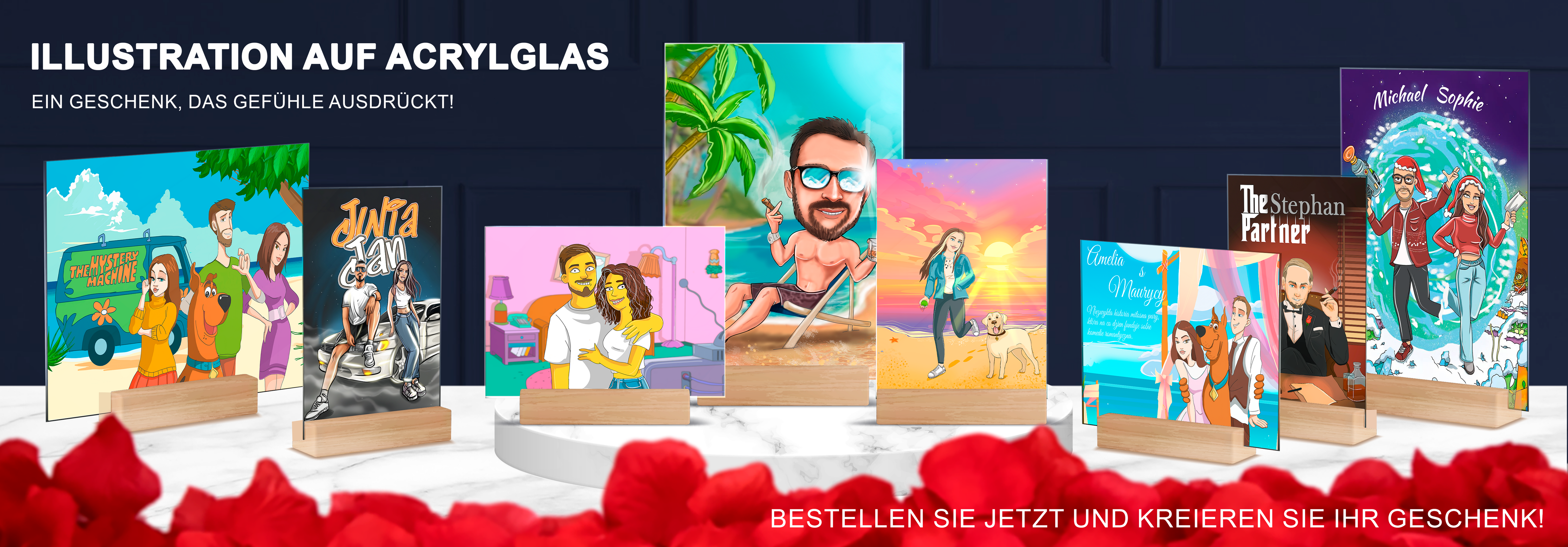 Illustrationen auf Glas sind eine moderne und elegante Art, besondere Erinnerungen zu bewahren. Mit ihren einzigartigen Designs und Personalisierungsmöglichkeiten werden sie zur perfekten Geschenkidee, die jeden erfreut. Der hochwertige Druck auf Acrylglas verleiht ihnen einen einzigartigen Glanz und Tiefe, und die sorgfältig ausgewählten Kompositionen machen sie zu einem perfekten dekorativen Element. Egal zu welchem Anlass, die Illustrationen auf Glas sind ein einzigartiges Symbol der Zuneigung und der gemeinsam verbrachten Momente.