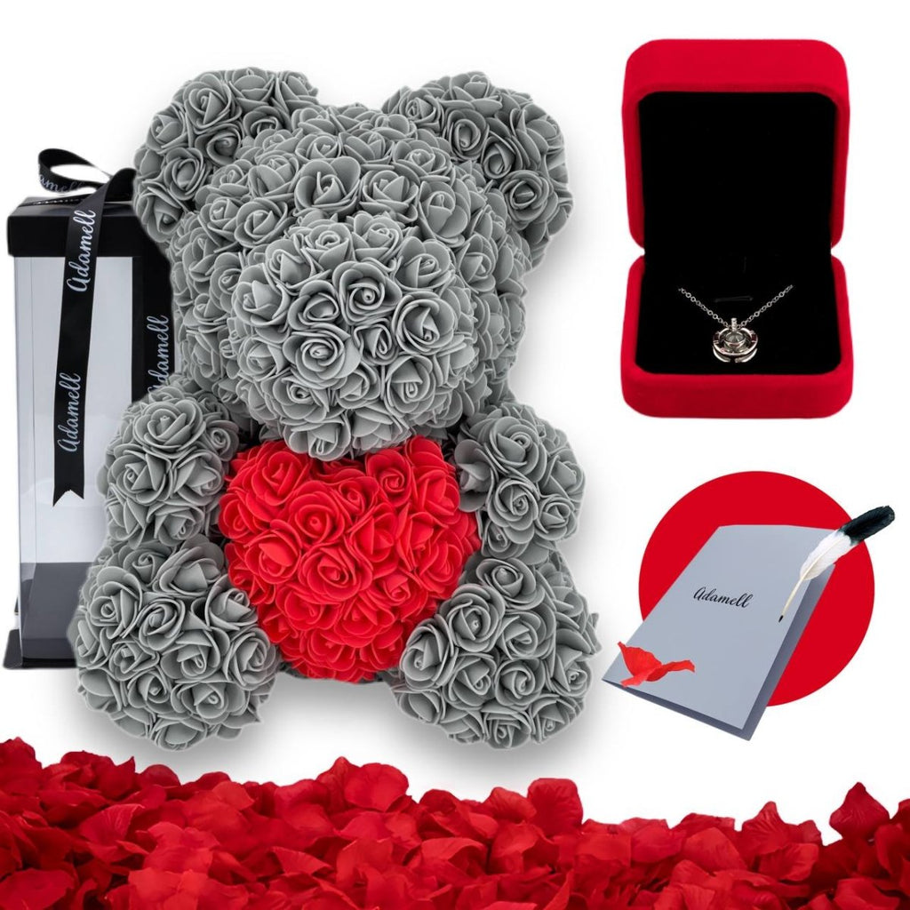 Der Teddybär besteht aus über 300 Blumen und ist mit einer exquisiten Geschenkbox verziert. Der 25 cm große Teddybär ist in drei Farben erhältlich: rot, weiß und pink. Der Rosen-Teddybär kommt auch mit einer Hologramm-Kette als unerwartete Art zu sagen: Ich liebe dich.