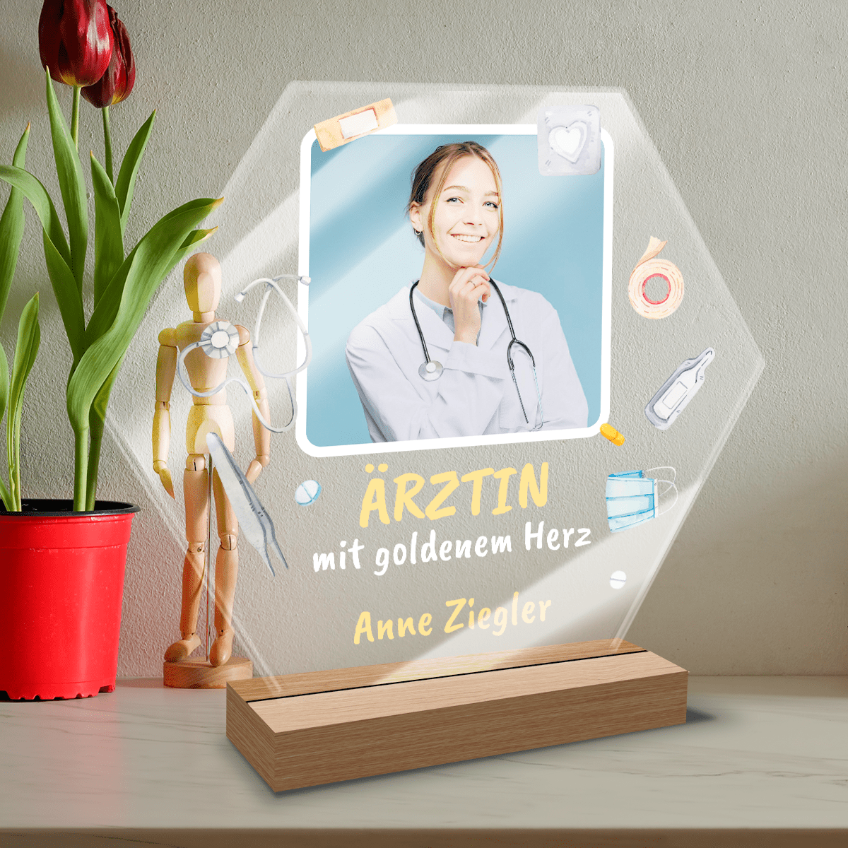 Arzt mit Herz aus Gold - Druck auf Glas, personalisiertes Geschenk für Arzt