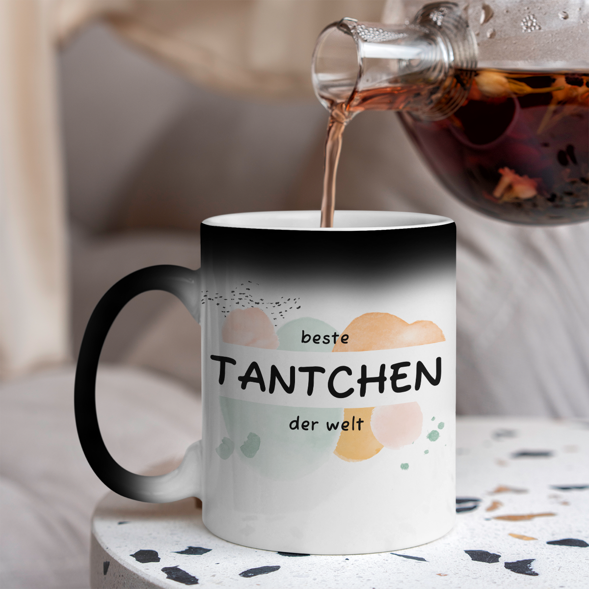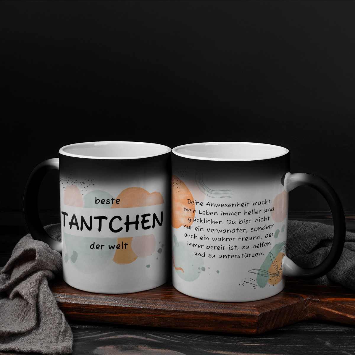 Ein schwarzer, scheinbar unauffälliger Becher wird Ihren täglichen Kaffee oder Tee mit ein wenig Magie noch besser schmecken lassen. Füllen Sie die Tasse einfach mit einem heißen Getränk und Sie werden eine Grafik, ein Foto oder eine Aufschrift sehen, die darunter versteckt ist!
