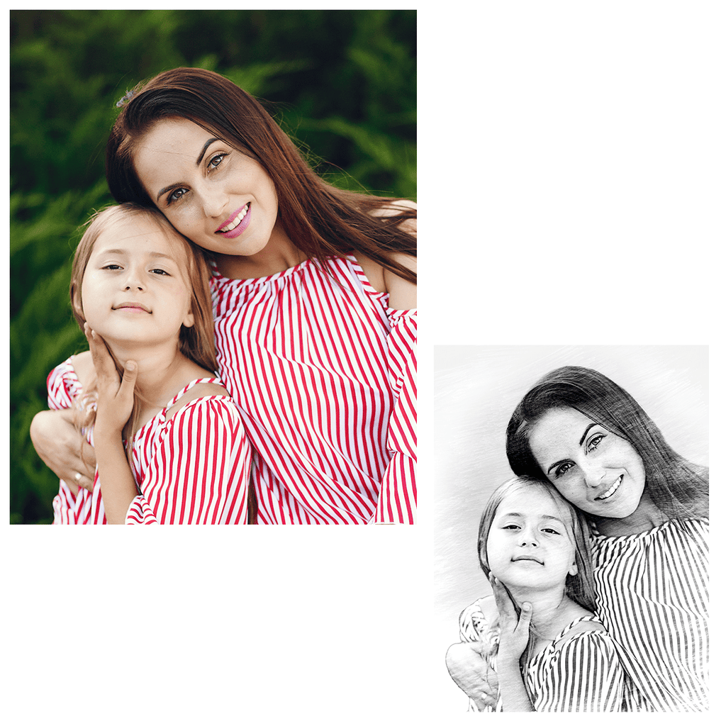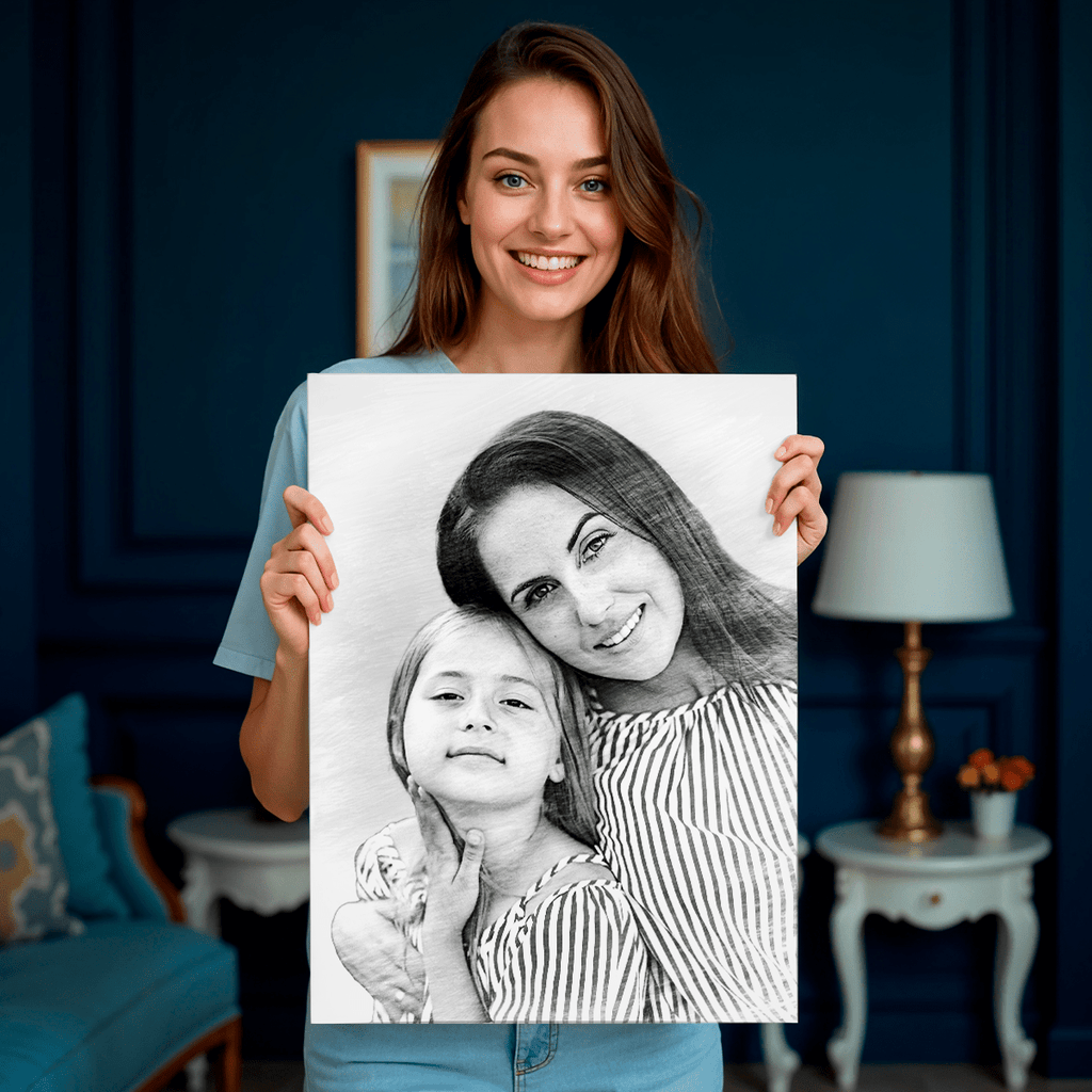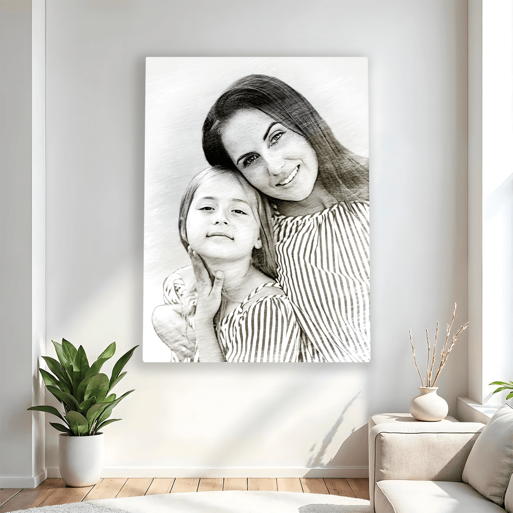 Bleistiftskizze von Mutter und Tochter - Druck auf Leinwand, personalisiertes Geschenk für Mama