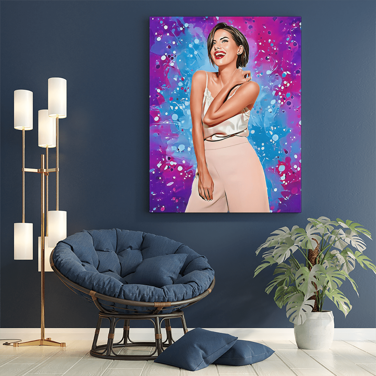 Das von Ihnen eingereichte Foto wird in ein Porträt mit mehrfarbigem Hintergrund umgewandelt. Die Vorschaubilder auf der Website zeigen, welcher grafische Effekt erzielt werden kann. Alles, was Sie brauchen, ist ein Foto in guter Qualität von der Person, die Sie beschenken möchten.
