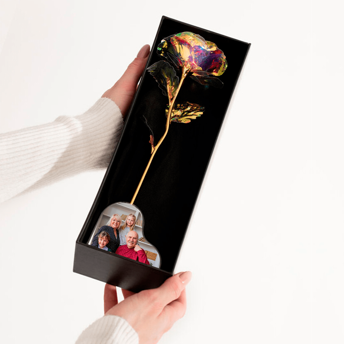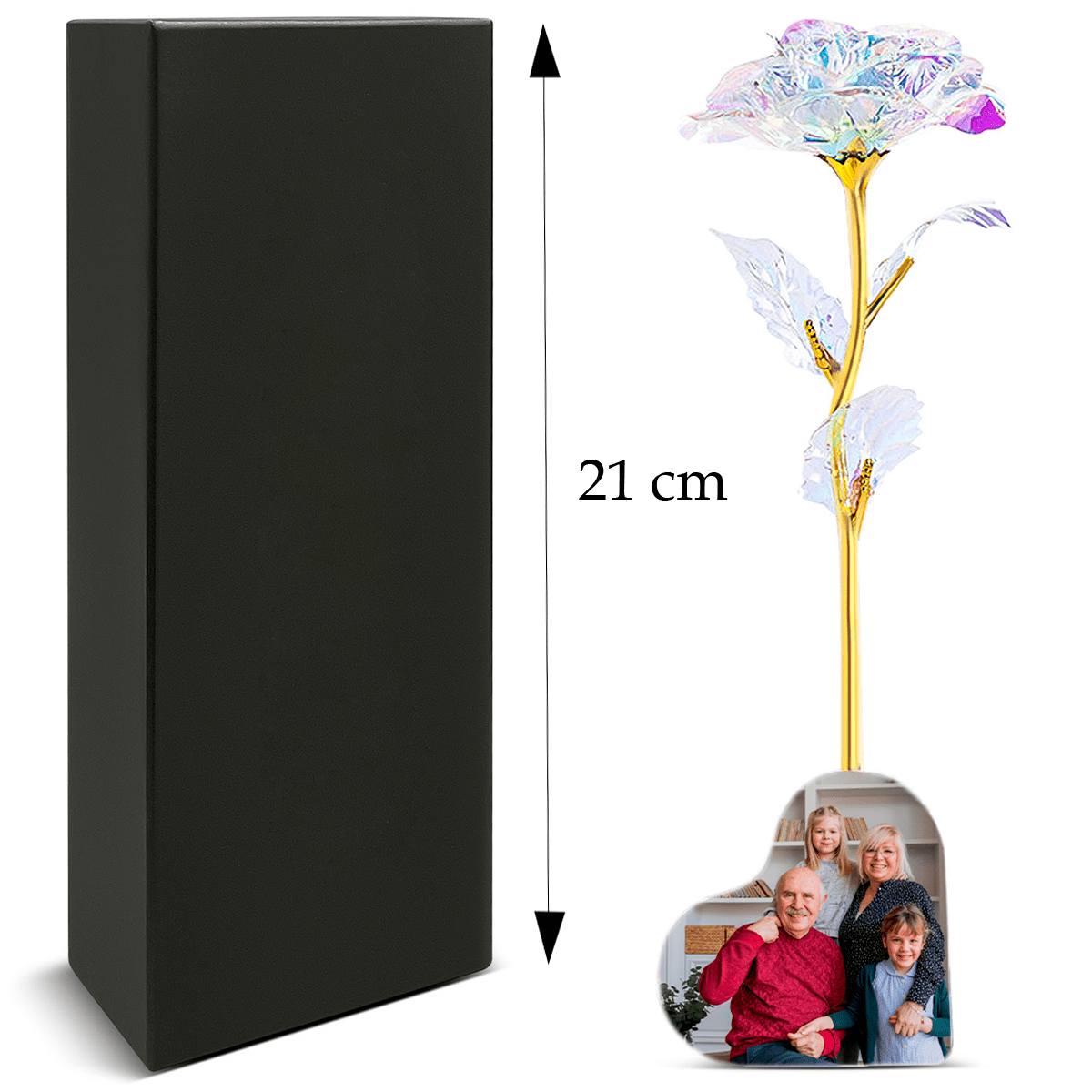 Zusammen mit der Rose erhalten Sie ein bedrucktes Glasherz. Sie können es mit einem Foto Ihrer Wahl personalisieren! Dann wird das Geschenk noch einmaliger!