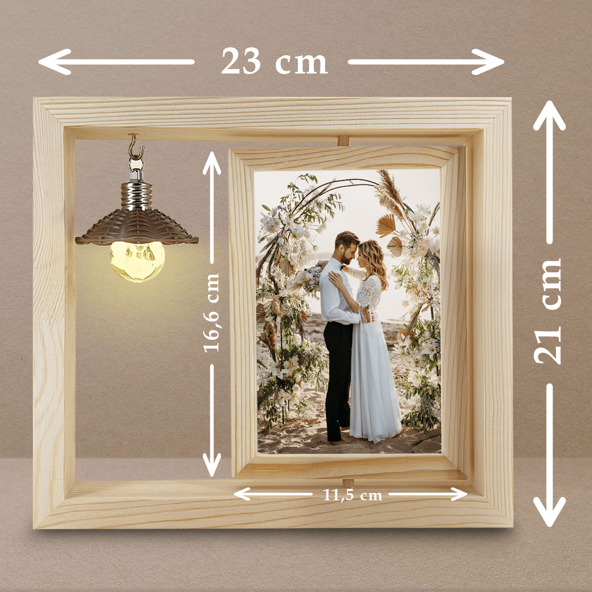 Der Ausdruck wird außerdem mit einem Rahmen aus hochwertigem Holz geliefert. Er ermöglicht es Ihnen, das Glas auf bequeme Weise zu positionieren, da er mit einem beweglichen, drehbaren Element ausgestattet ist. Ein weiterer Vorteil ist die LED-Birne, die den Druck mit warmem Licht beleuchtet und so zu einer originellen Lampe wird.