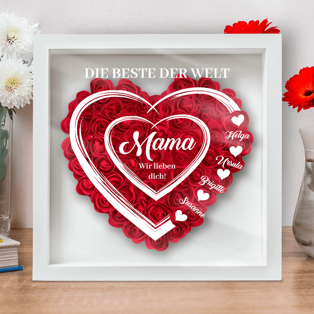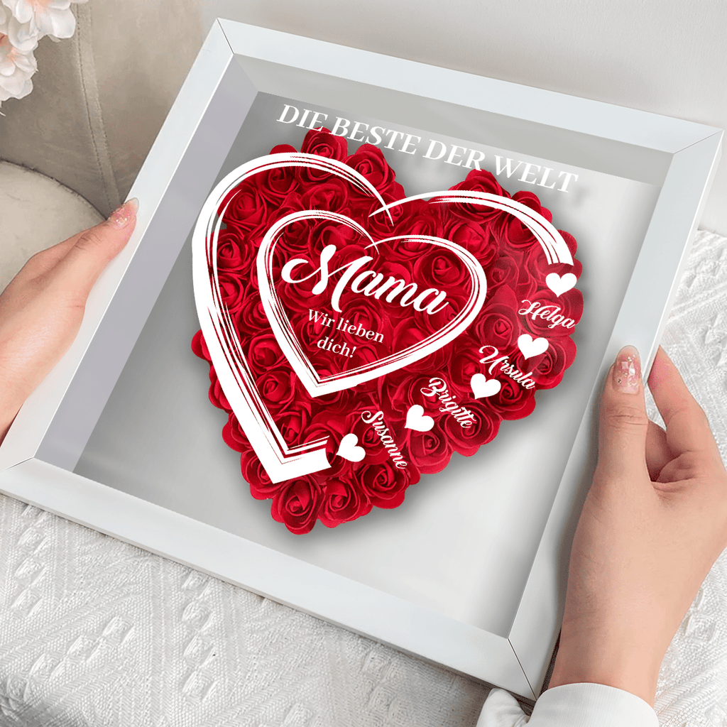 Das Herz im Inneren des Rahmens ist aus einem hochwertigen Material gefertigt, das echte Rosen täuschend echt imitiert. Die gesamte Komposition wurde sorgfältig arrangiert und dauerhaft auf die Rückseite des Rahmens geklebt.