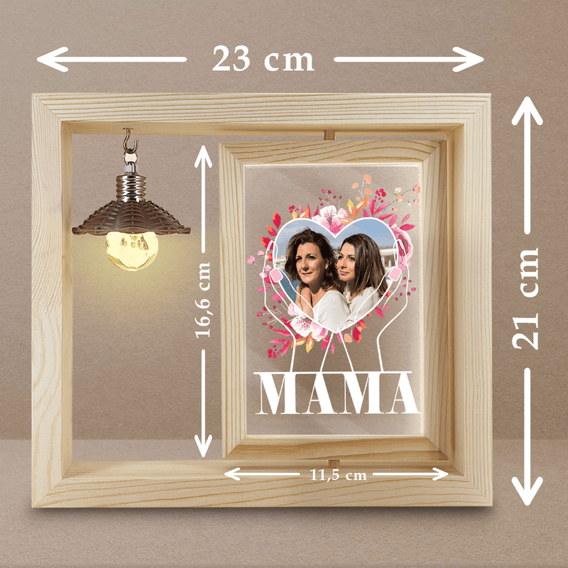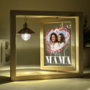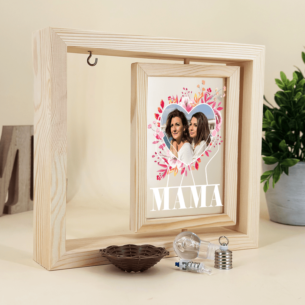 Herz in den Händen - Druck auf Glas in Holzrahmen + led, personalisiertes Geschenk für Mutter