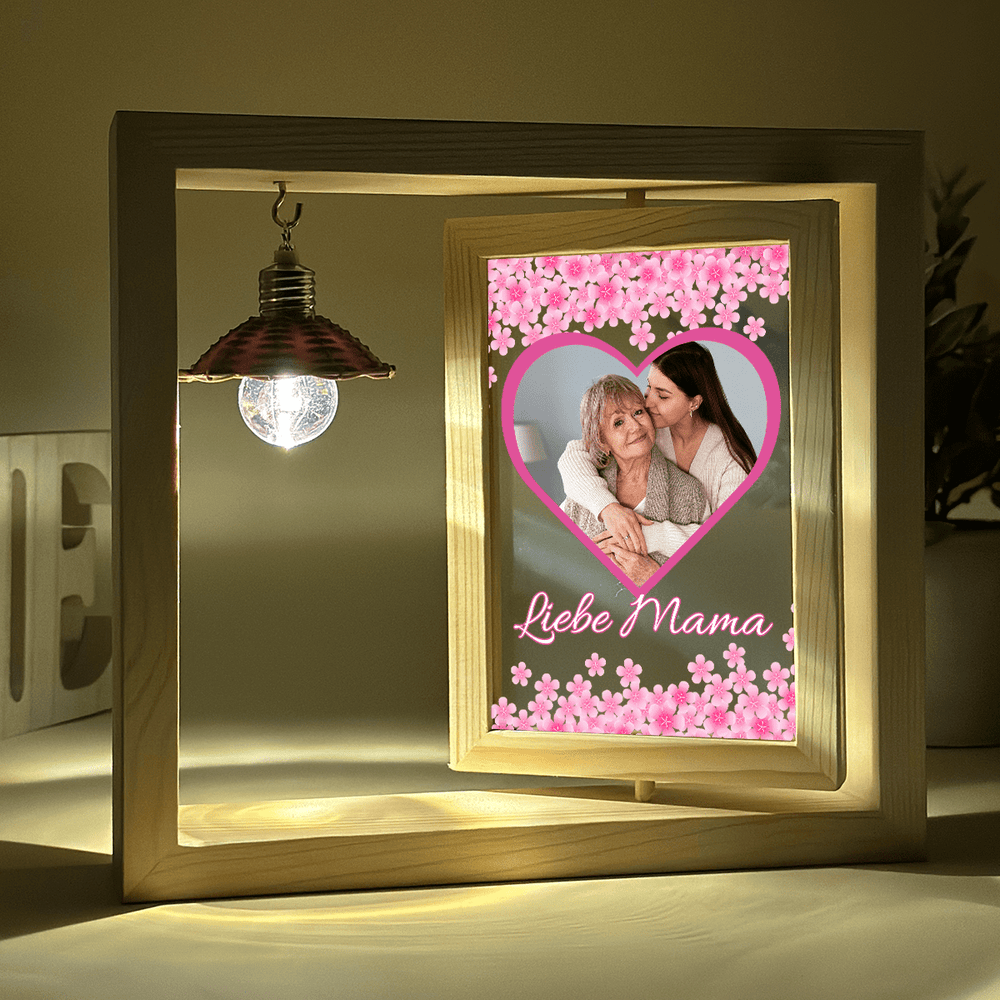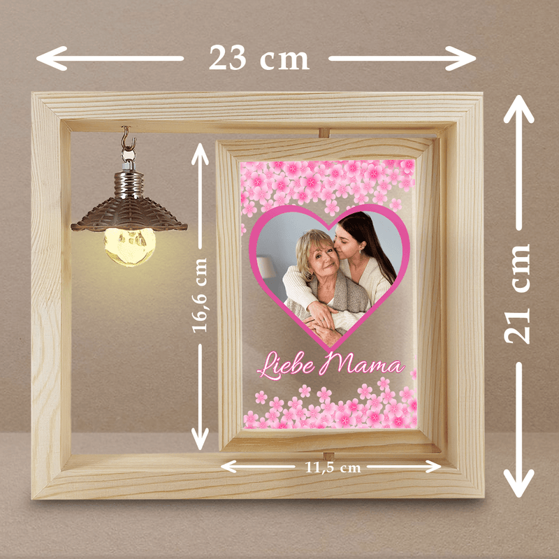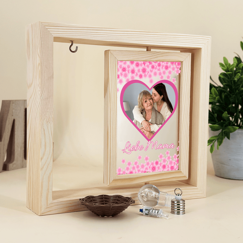 Herz und Blumen - Druck auf Glas in Holzrahmen + led, personalisiertes Geschenk für Mama