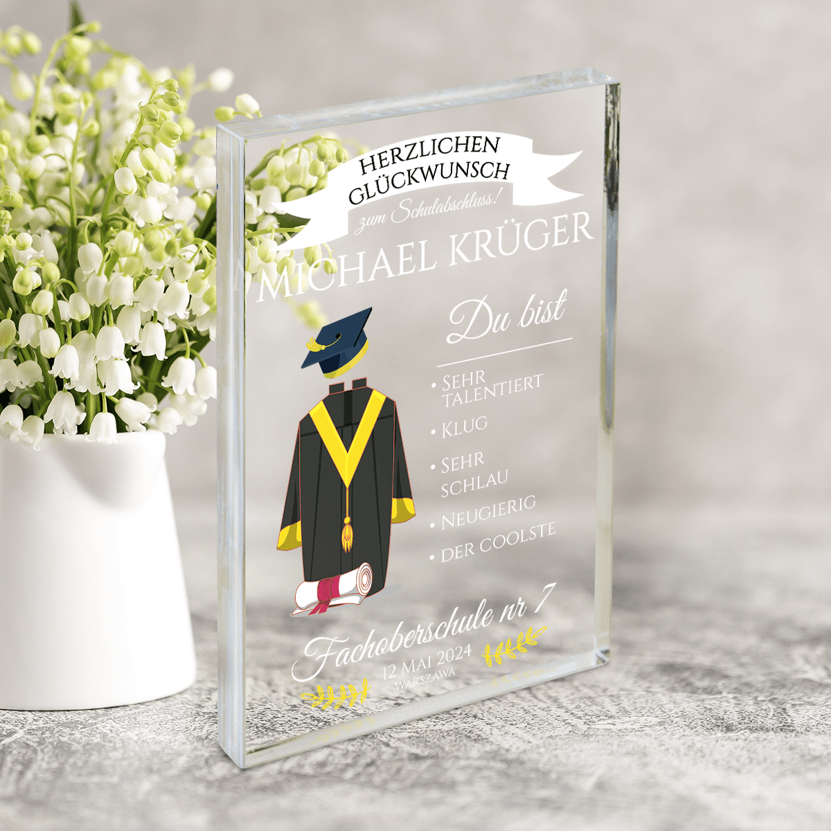 Herzlichen Glückwunsch zum Schulabschluss - Druck auf Glas, personalisiertes Geschenk für Absolventen
