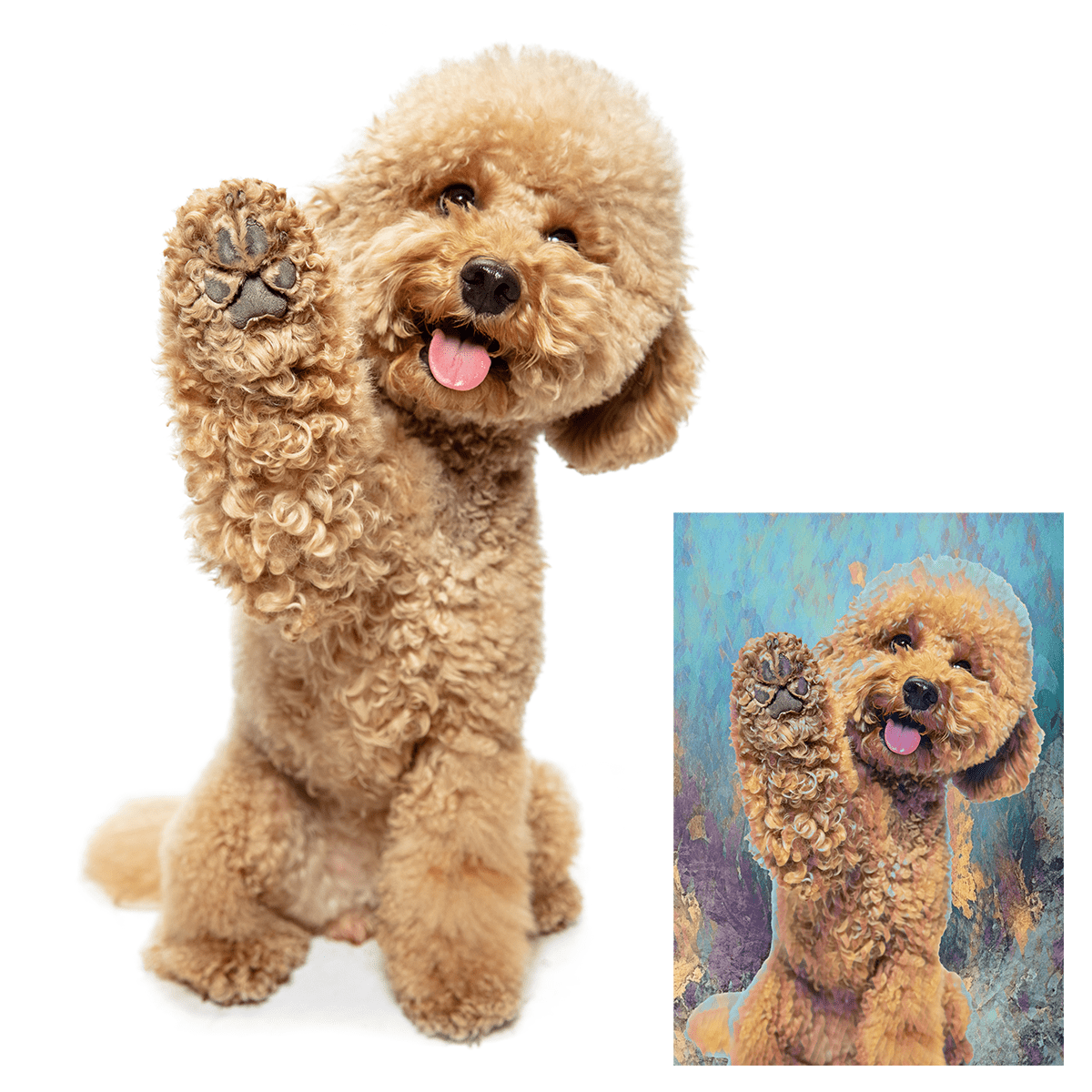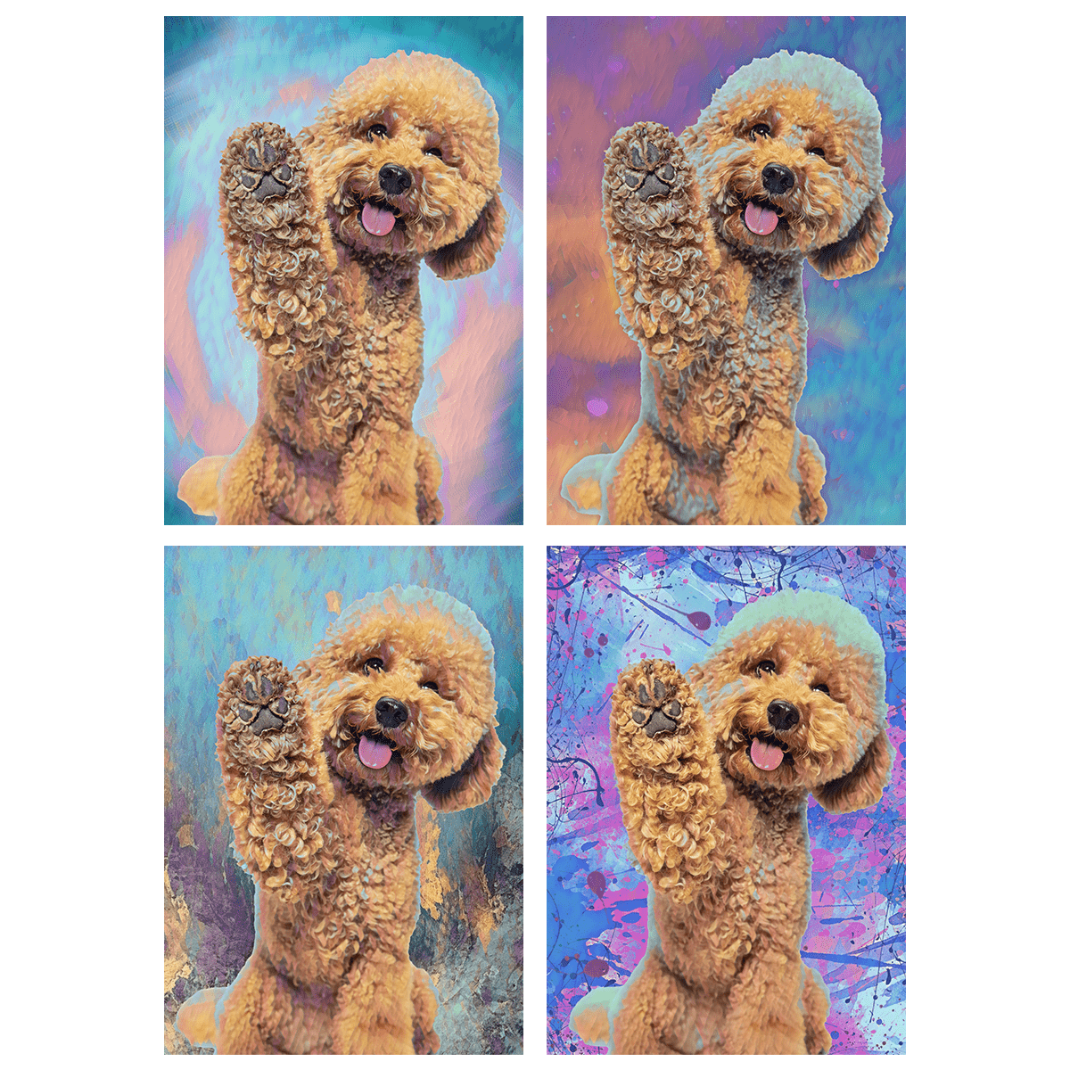 Das von Ihnen eingereichte Foto wird in ein Porträt mit mehrfarbigem Hintergrund umgewandelt. Die Vorschaubilder auf der Website zeigen, welcher grafische Effekt erzielt werden kann. Alles, was Sie brauchen, ist ein Foto in guter Qualität von der Person, die Sie beschenken möchten.