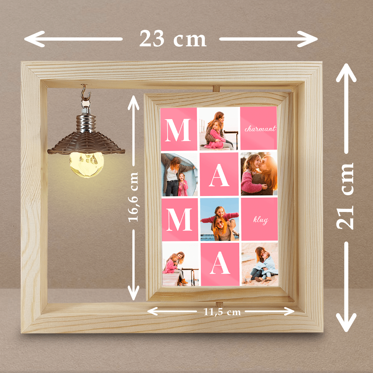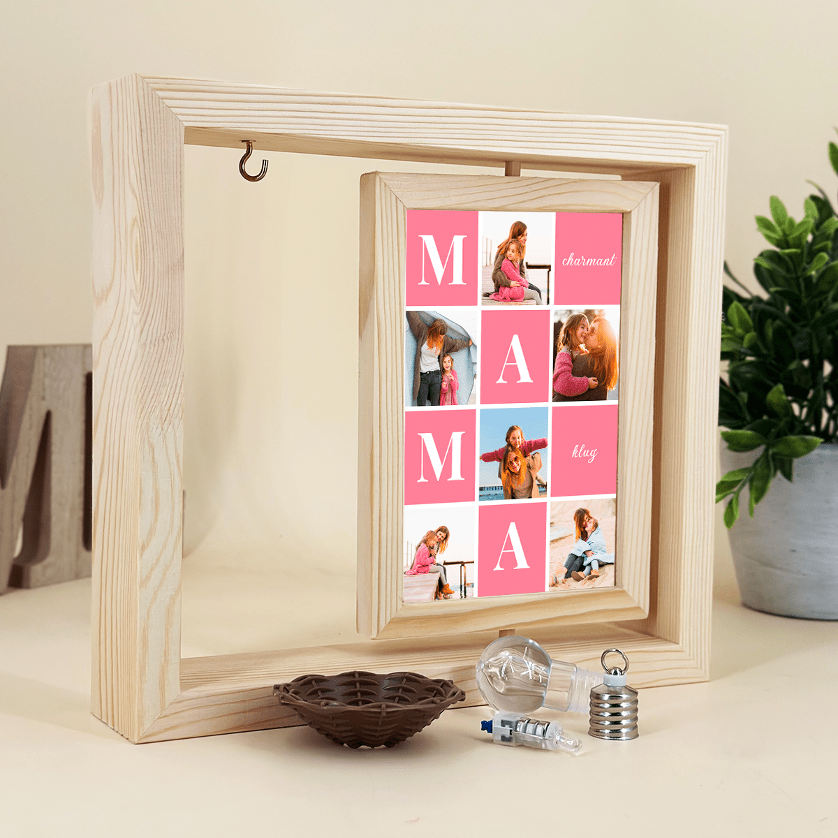Klug und charmant - Druck auf Glas in Holzrahmen + led, personalisiertes Geschenk für Mama