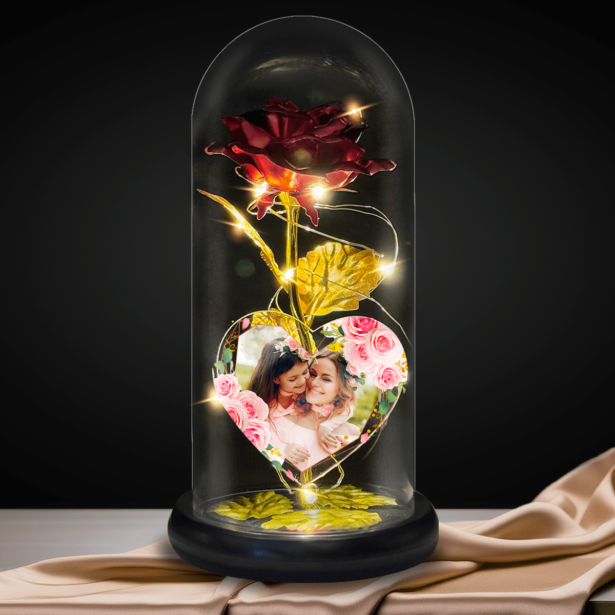 LED Ewige Rose in Glas rot und gold + personalisiertes Herz MAMA & KIND