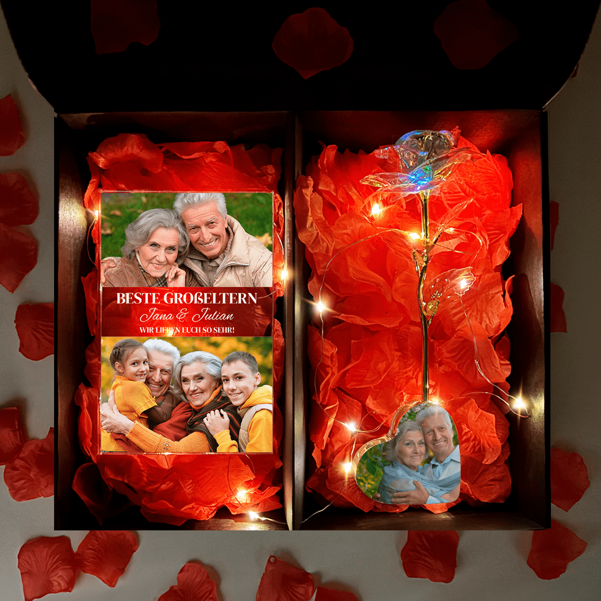 Mit der Rose erhalten Sie ein bedrucktes Glasherz und einen rechteckigen Aufdruck. Sie können es mit einem Foto Ihrer Wahl personalisieren! Dann wird das Geschenk noch einmaliger!