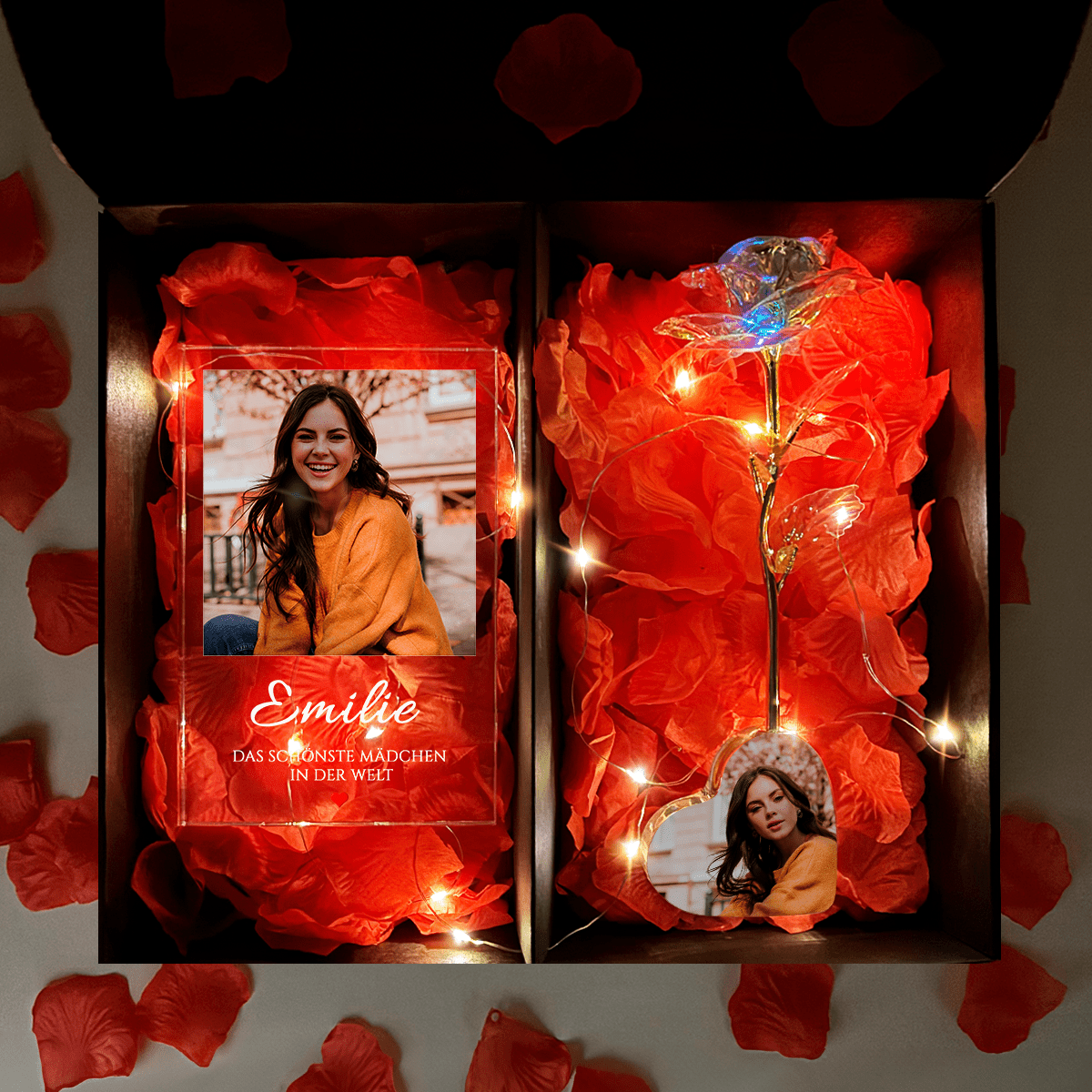 Mit der Rose erhalten Sie ein bedrucktes Glasherz und einen rechteckigen Aufdruck. Sie können es mit einem Foto Ihrer Wahl personalisieren! Dann wird das Geschenk noch einmaliger!