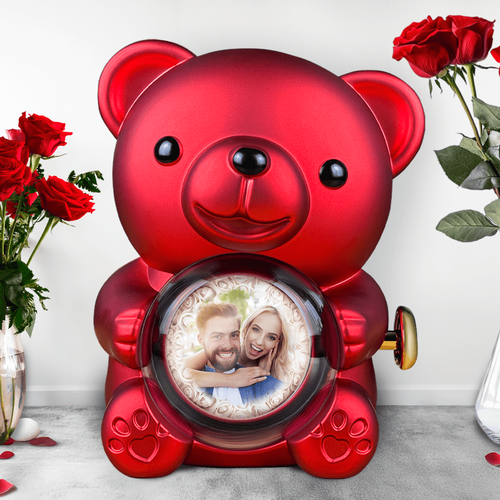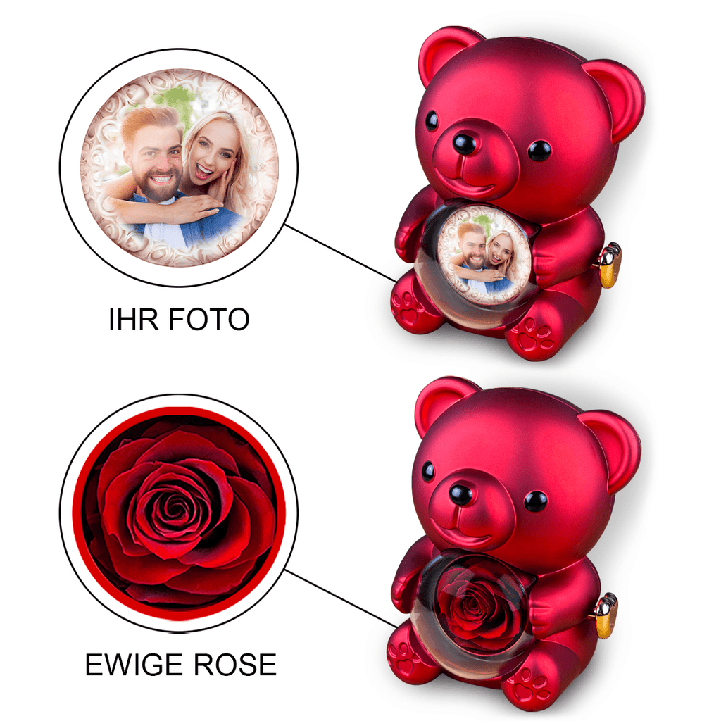 Paarfoto mit Hintergrund - Teddybär mit ewiger Rose und Aufdruck, personalisiertes Geschenk für Mann