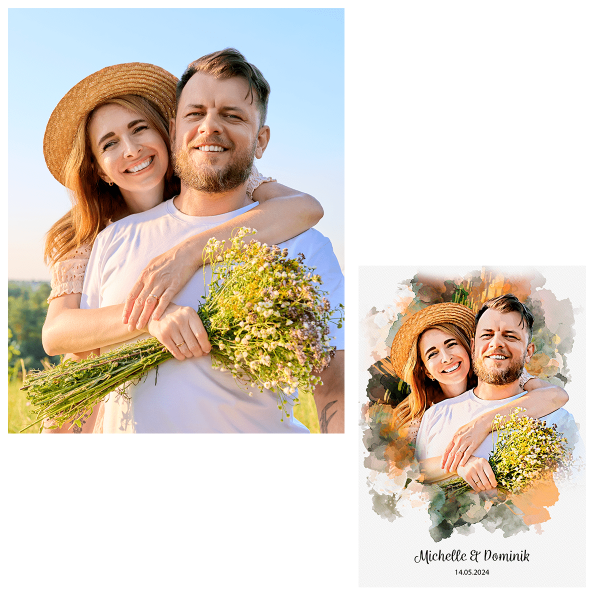 Das von Ihnen eingereichte Foto wird in ein Porträt mit mehrfarbigem Hintergrund umgewandelt. Die Vorschaubilder auf der Website zeigen, welcher grafische Effekt erzielt werden kann. Alles, was Sie brauchen, ist ein Foto in guter Qualität von der Person, die Sie beschenken möchten.