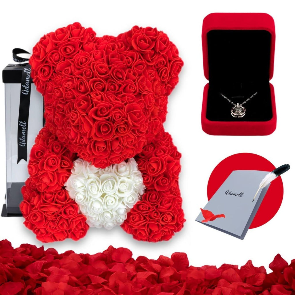 Der Teddybär besteht aus über 300 Blumen und ist mit einer exquisiten Geschenkbox verziert. Der 25 cm große Teddybär ist in drei Farben erhältlich: rot, weiß und pink. Der Rosen-Teddybär kommt auch mit einer Hologramm-Kette als unerwartete Art zu sagen: Ich liebe dich.