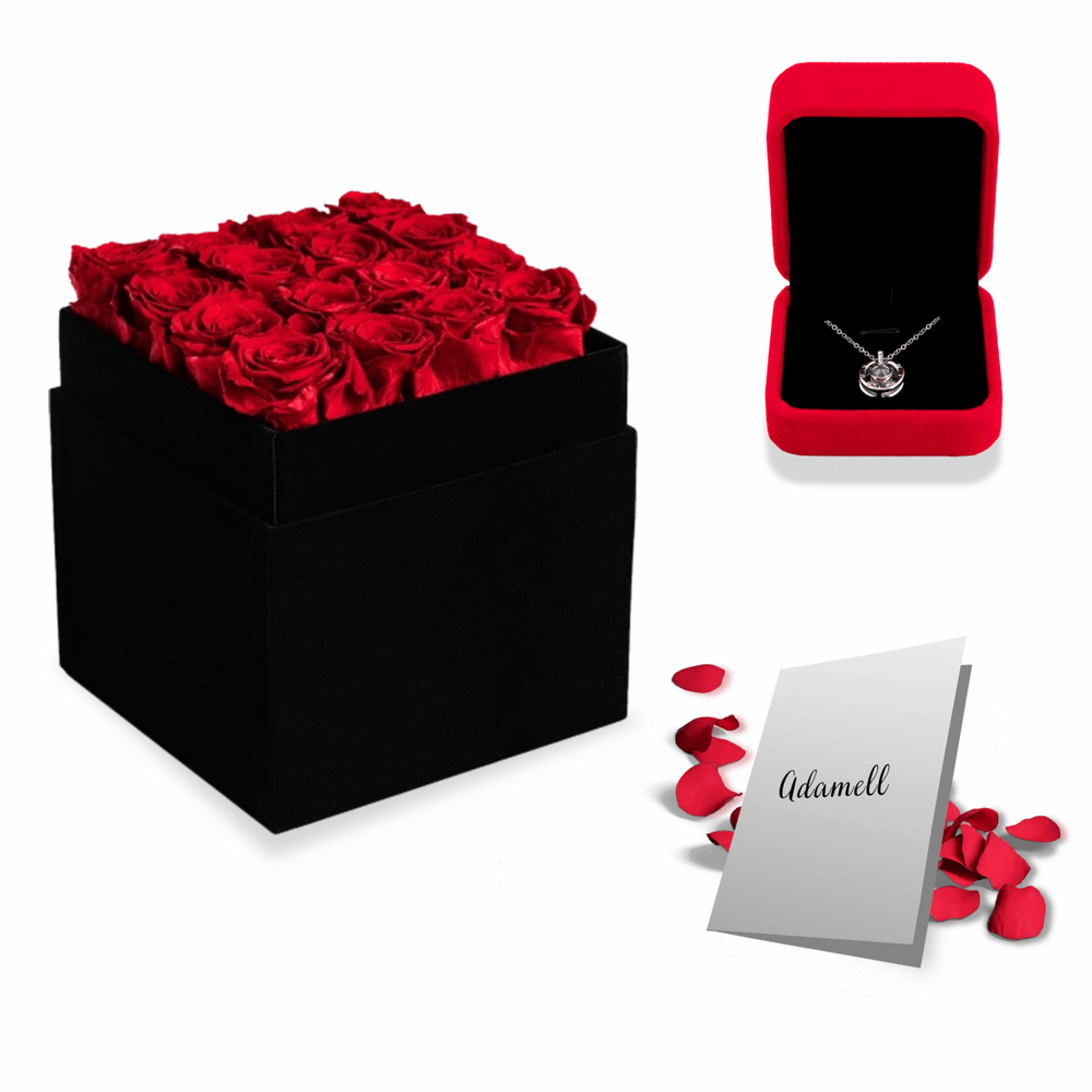 Stabilisierte, immerwährende Rosen in einer eleganten Veloursschachtel, plus: