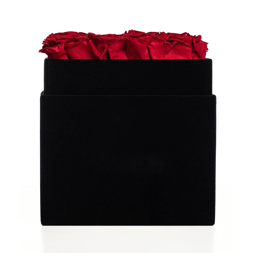 Schöne Blumen erfreuen immer wieder aufs Neue. Die quadratische Schachtel aus Velours unterstreicht die Schönheit der Rosen.