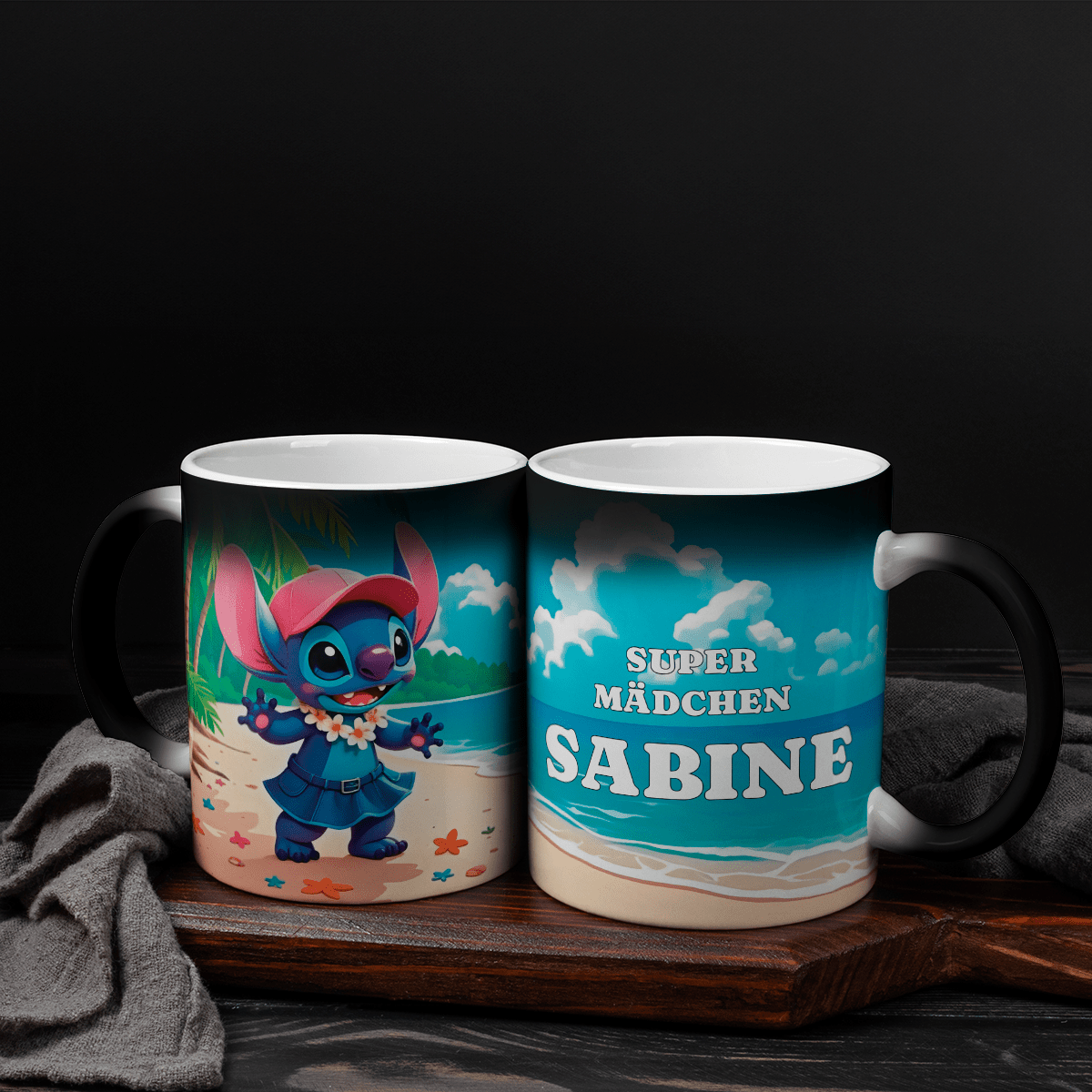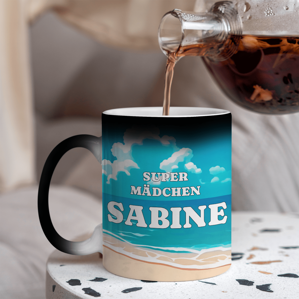Ein schwarzer, scheinbar unauffälliger Becher wird Ihren täglichen Kaffee oder Tee mit ein wenig Magie noch besser schmecken lassen. Füllen Sie die Tasse einfach mit einem heißen Getränk und Sie werden eine Grafik, ein Foto oder eine Aufschrift sehen, die darunter versteckt ist!