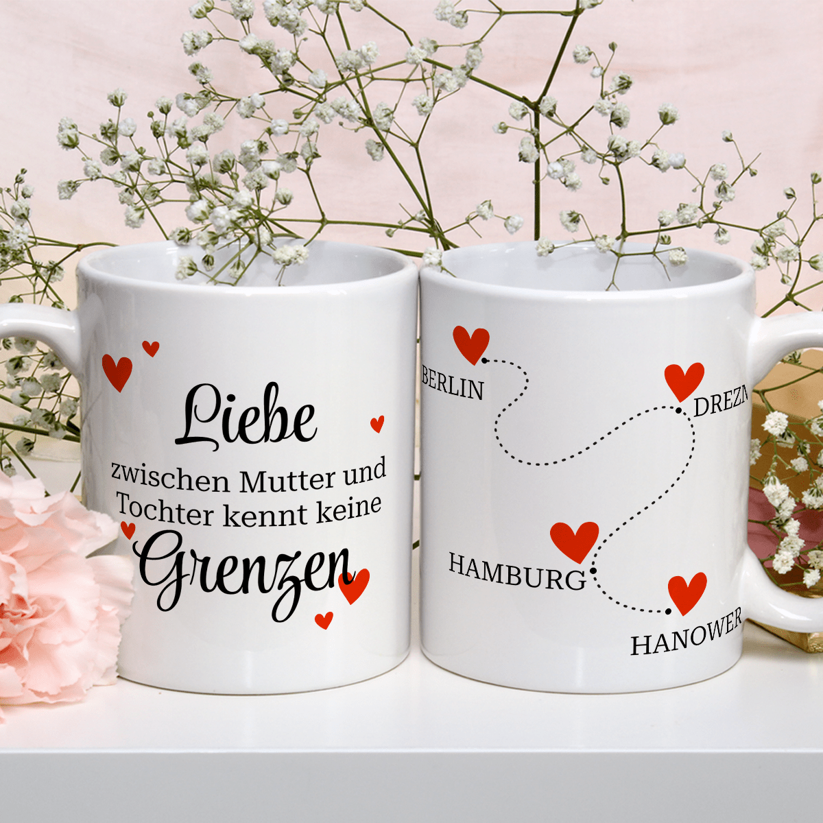 Unsere Liebe, die keine Grenzen kennt - 1x bedruckte Tasse, personalisiertes Geschenk für Mama