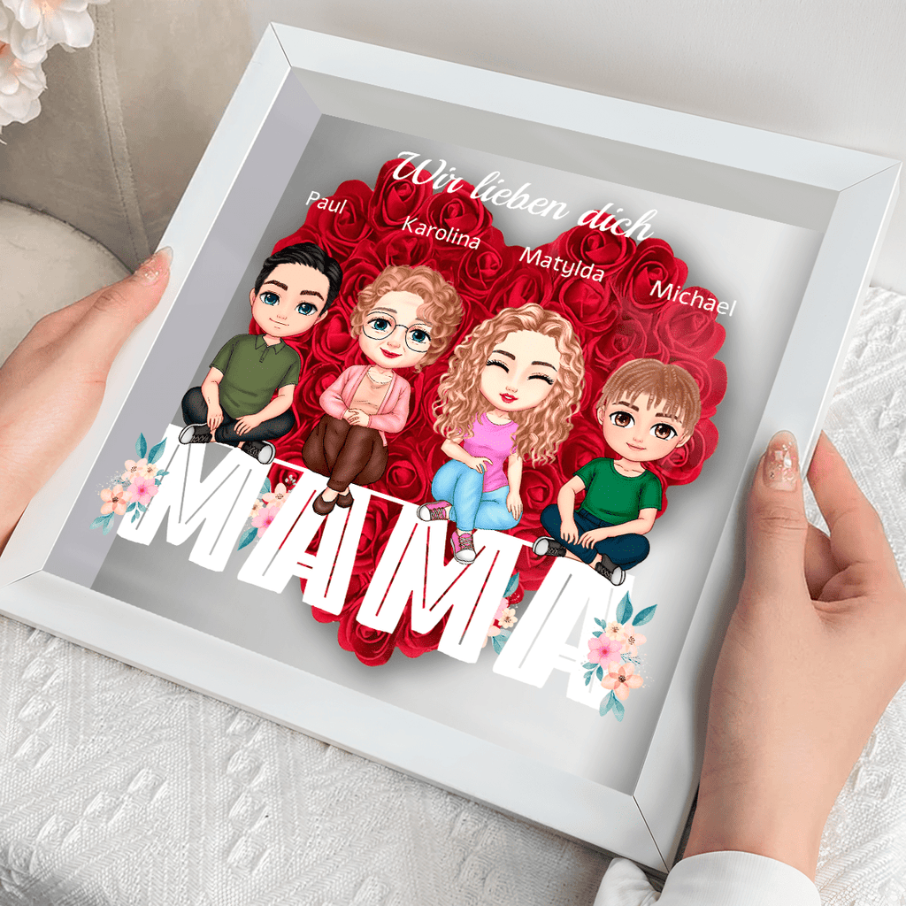 Das Herz im Inneren des Rahmens ist aus einem hochwertigen Material gefertigt, das echte Rosen täuschend echt imitiert. Die gesamte Komposition wurde sorgfältig arrangiert und dauerhaft auf die Rückseite des Rahmens geklebt.